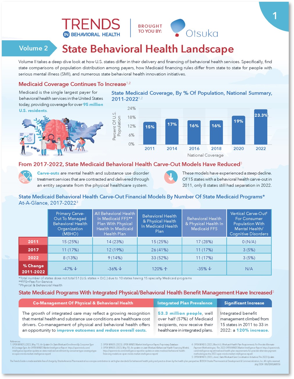 Volume 2 takes a deep dive look at how U.S. states differ in their delivery and financing of behavioral health services. Specifically, find state comparisons of population distribution among payers, how Medicaid financing rules differ from state to state for people with serious mental illness (SMI), and numerous state behavioral health innovation initiatives.
